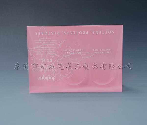 這款護(hù)膚品的展示座,采用8CM的亞克力透明材料切割成陡坡型再在左上雕刻兩個圓槽放產(chǎn)品,反正正看文字圖案和粉底色。采用亞克力板材制作的亞克力展示架外形優(yōu)美、晶瑩剔透,在產(chǎn)品陳列時能有效提高產(chǎn)品的顯示檔次,凸顯產(chǎn)品的品牌形象。出了外形和板材本身的優(yōu)勢外,亞克力展示架的顏色顏色搭配也至關(guān)重要,好的搭配可以讓展示架的效果事半功倍。這個展示座搭配粉色給大家一種天然輕松的Feel。