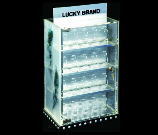 該產品是亞克力手表展示柜,大小和外形可以根據要求訂做。頂上一塊板印的是logo,非常顯眼讓客人對產品的品牌一目了然,過目不忘。柜子里面也可以裝一些燈帶,讓產品展示得更加完美。