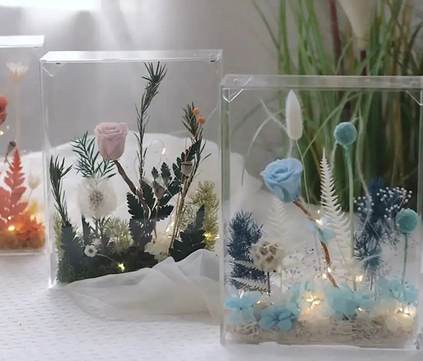 這款亞克力畫框采用全透明亞克力制作而成,五面粘接一面磁吸,里面擺放一些永生花,美不勝收,擺放在任何地方都是一道亮麗的風景線,如果看膩了里面的永生花可以隨時更換,當然如果你不喜歡永生花了你也可以改換其他的物件擺放,即防塵防潮又美觀。